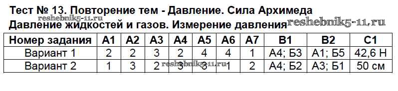 Готовая домашняя работа с ответами по Физике за 7 класс Бобошина Контрольно-измерительные материалы (КИМ) Экзамен 2014 ФГОС - Тесты Тест №13. Повторение тем - Давление. Сила Архимеда и др.