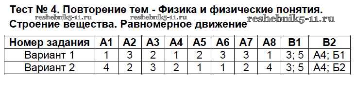 Готовая домашняя работа с ответами по Физике за 7 класс Бобошина Контрольно-измерительные материалы (КИМ) Экзамен 2014 ФГОС - Тесты Тест №4. Повторение тем - Физика и физические понятия и др.