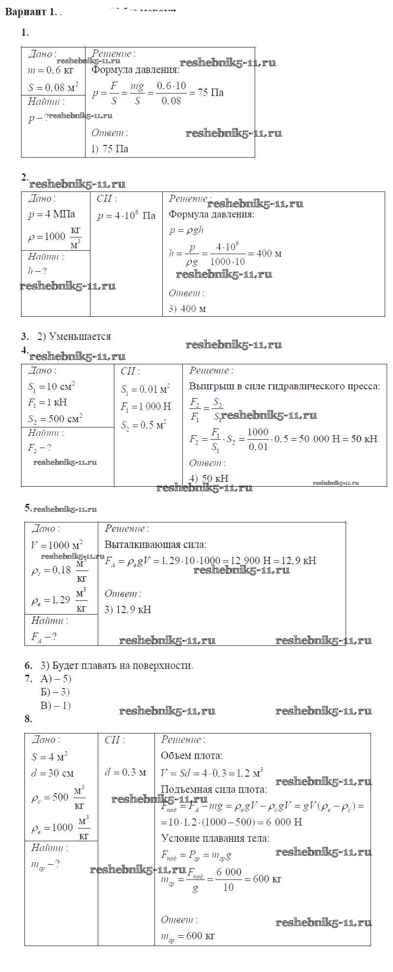 Решебник / контрольная работа / глава 3. давление твердых тел, жидкостей и газов / вар. 1
