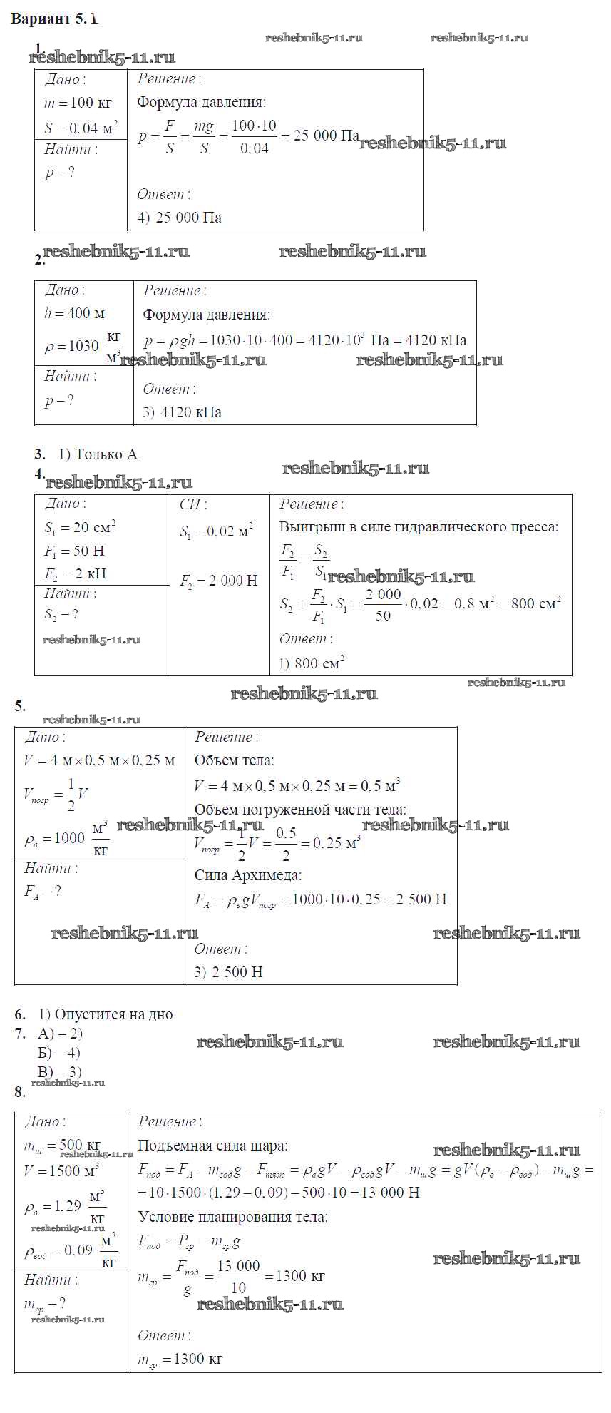 Решебник / контрольная работа / глава 3. давление твердых тел, жидкостей и газов / вар. 5