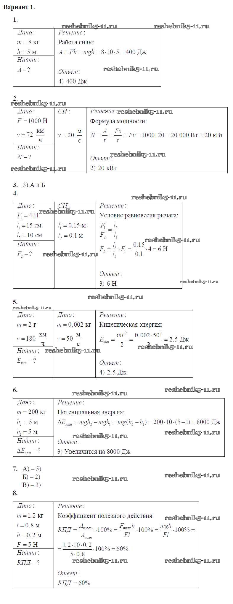 Готовая домашняя работа с ответами по Физике за 7 класс Громцева Контрольные и самостоятельные работы УМК Экзамен 2020 ФГОС - Глава 4. Работа и мощность. Энергия Вар. 1