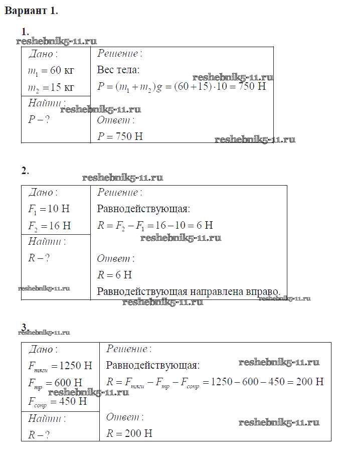 Готовая домашняя работа с ответами по Физике за 7 класс Громцева Контрольные и самостоятельные работы УМК Экзамен 2020 ФГОС - СР №21. Сложение сил направленных по одной прямой. Равнодействующая сил Вар. 1