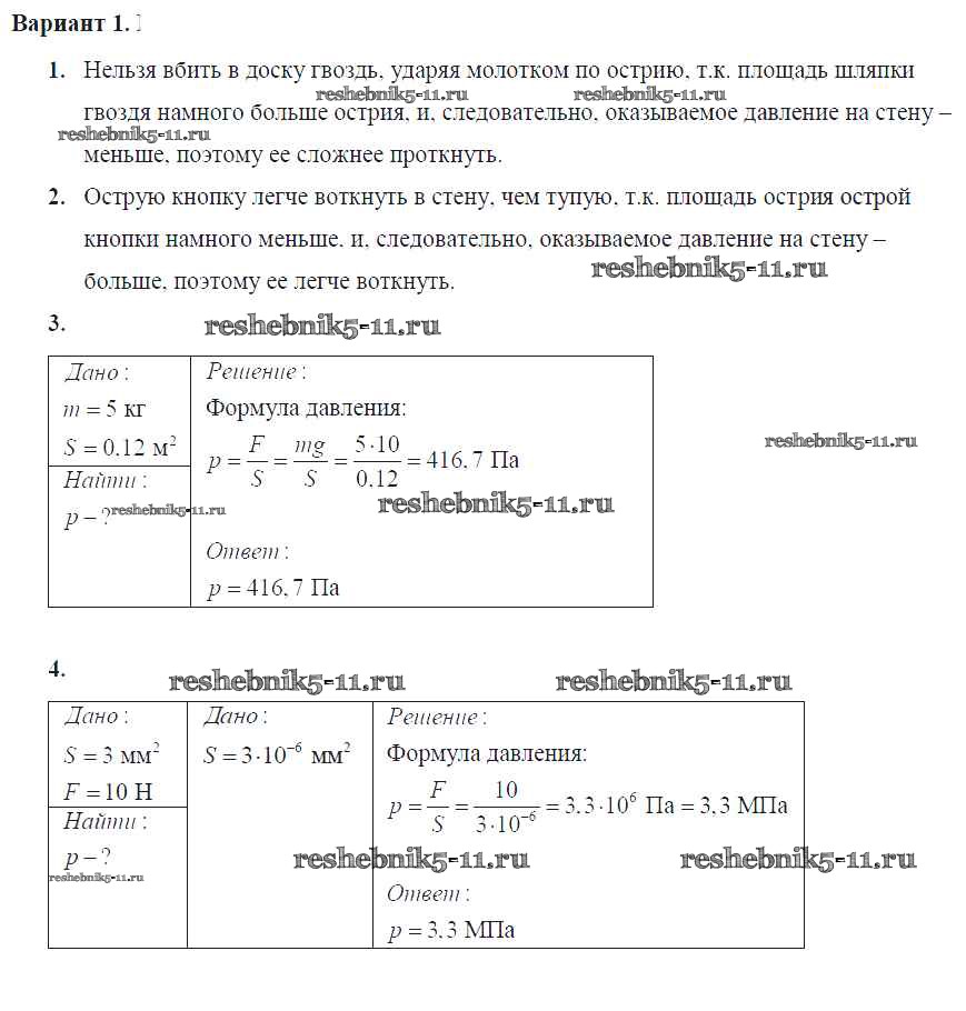 Готовая домашняя работа с ответами по Физике за 7 класс Громцева Контрольные и самостоятельные работы УМК Экзамен 2020 ФГОС - СР №24. Давление. Единицы давления Вар. 1