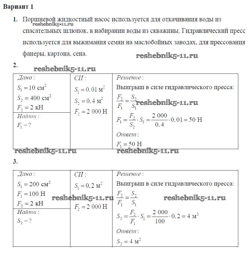 Готовая домашняя работа с ответами по Физике за 7 класс Громцева Контрольные и самостоятельные работы УМК Экзамен 2020 ФГОС - СР №34. Поршневой жидкостный насос. Гидравлический пресс Вар. 1