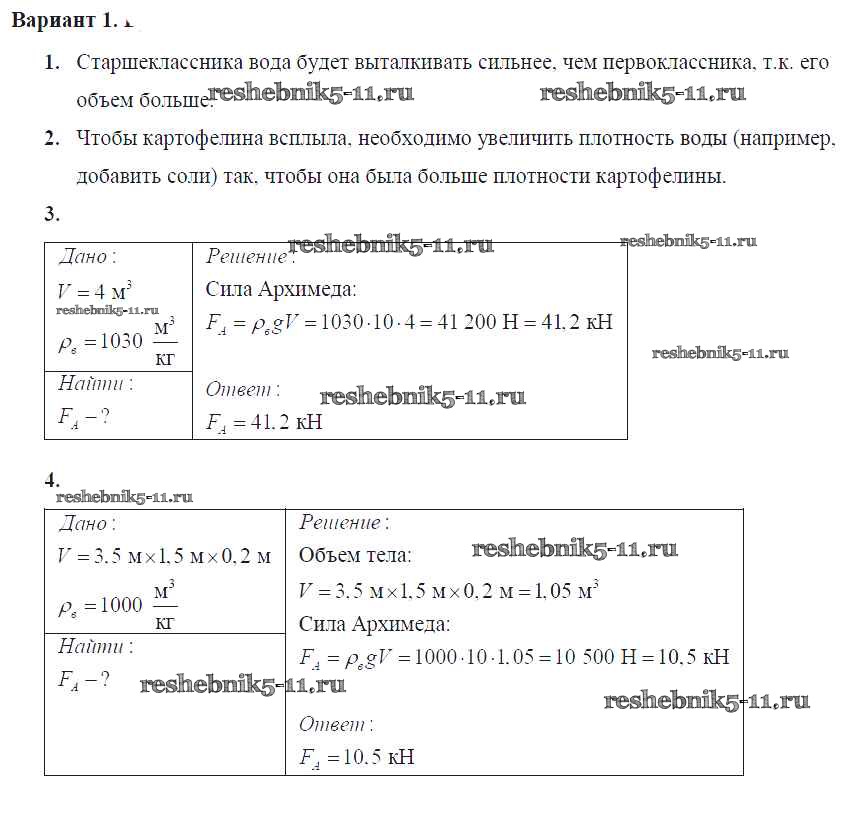 Готовая домашняя работа с ответами по Физике за 7 класс Громцева Контрольные и самостоятельные работы УМК Экзамен 2020 ФГОС - СР №37. Архимедова сила Вар. 1