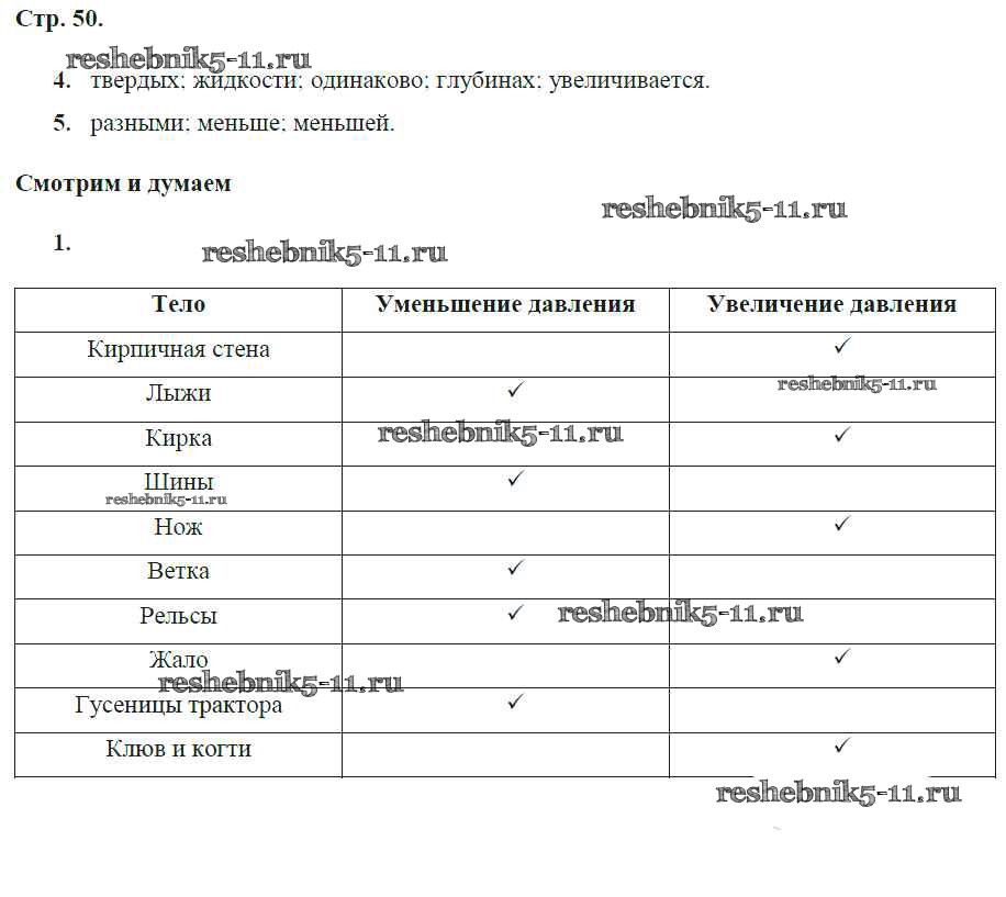 Готовая домашняя работа с ответами по Физике за 7 класс Артеменков, Белага, Воронцова, Ломаченков, Панебратцев Тетрадь-тренажер Сферы Просвещение 2016 ФГОС - Глава 5. Давление твёрдых тел, жидкостей и газов стр.50