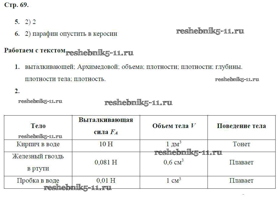 Готовая домашняя работа с ответами по Физике за 7 класс Артеменков, Белага, Воронцова, Ломаченков, Панебратцев Тетрадь-тренажер Сферы Просвещение 2016 ФГОС - Глава 7. Закон Архимеда. Плавание тел стр.69