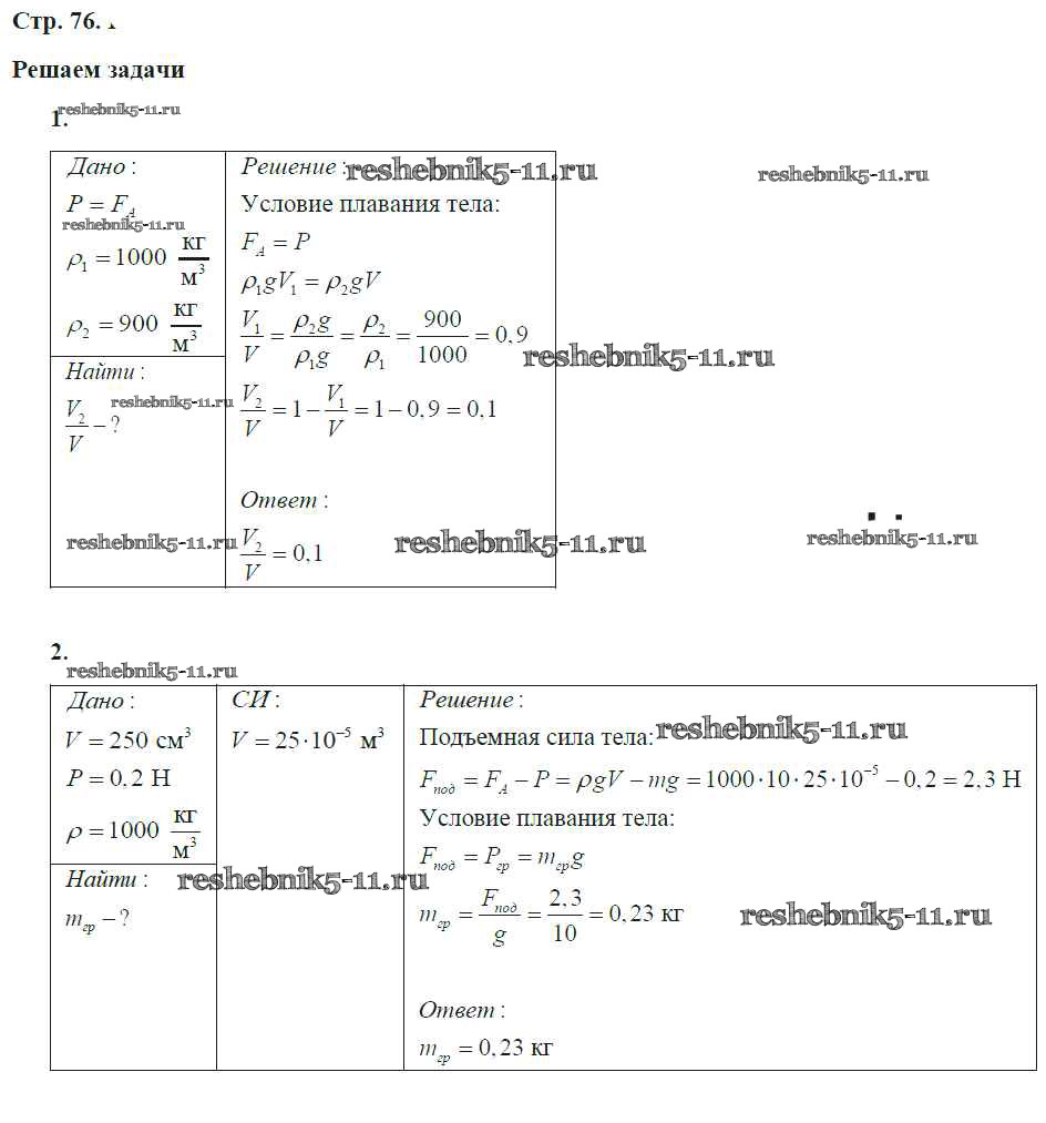 Готовая домашняя работа с ответами по Физике за 7 класс Артеменков, Белага, Воронцова, Ломаченков, Панебратцев Тетрадь-тренажер Сферы Просвещение 2016 ФГОС - Глава 7. Закон Архимеда. Плавание тел стр.76