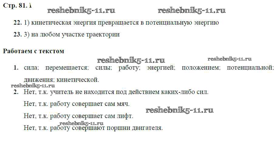 Готовая домашняя работа с ответами по Физике за 7 класс Артеменков, Белага, Воронцова, Ломаченков, Панебратцев Тетрадь-тренажер Сферы Просвещение 2016 ФГОС - Глава 8. Работа, мощность, энергия стр.81