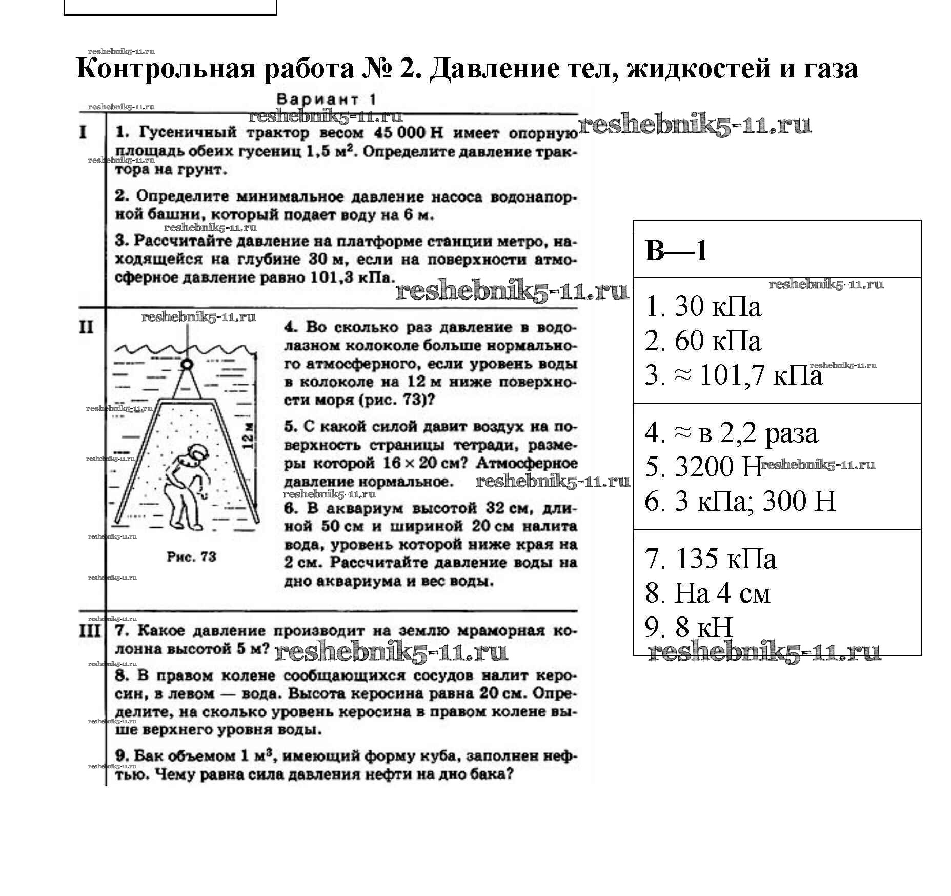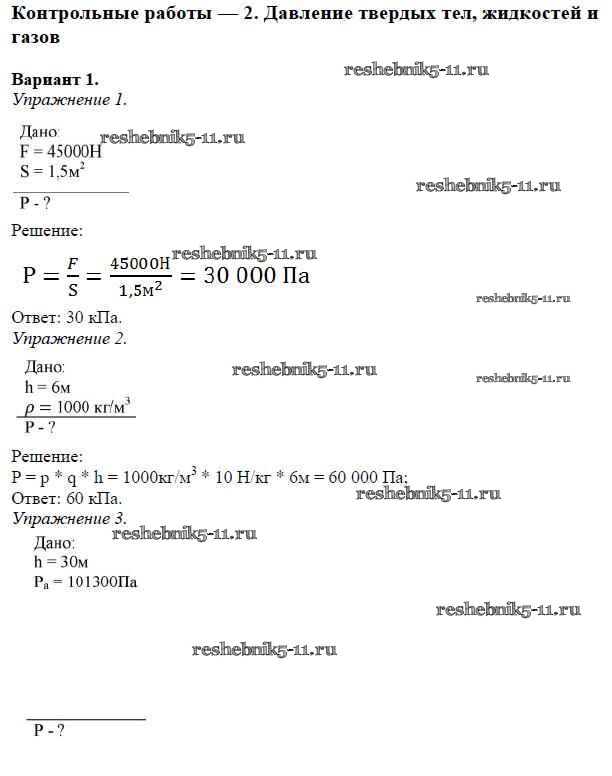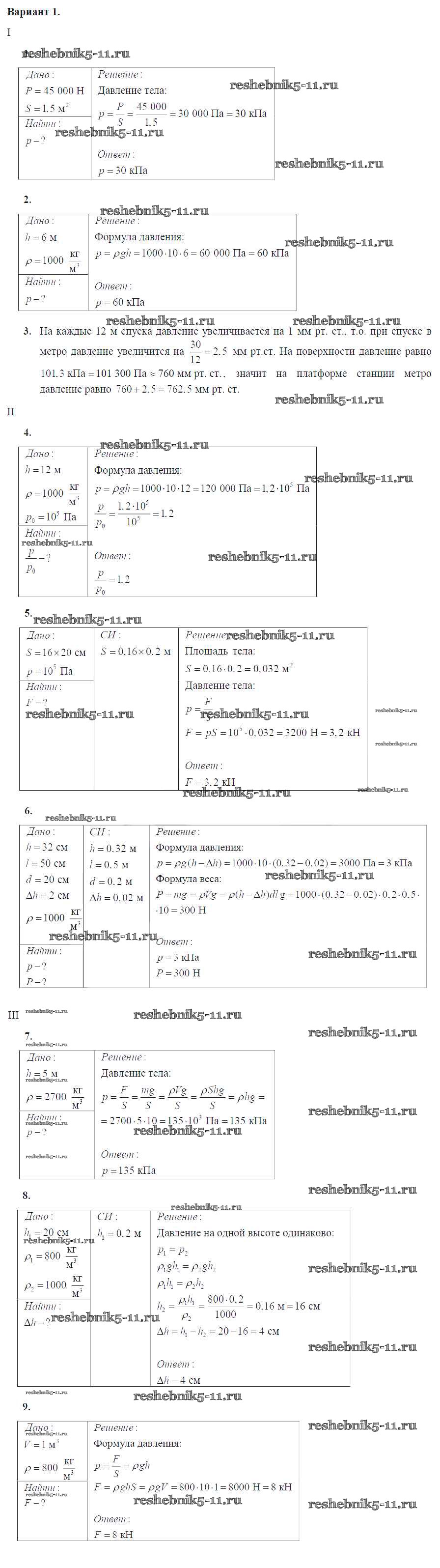 Готовая домашняя работа с ответами по Физике за 7 класс Марон Дидактические материалы Вертикаль Дрофа 2019 ФГОС - КР №-2. Давление твердых тел, жидкостей и газов Вариант №1