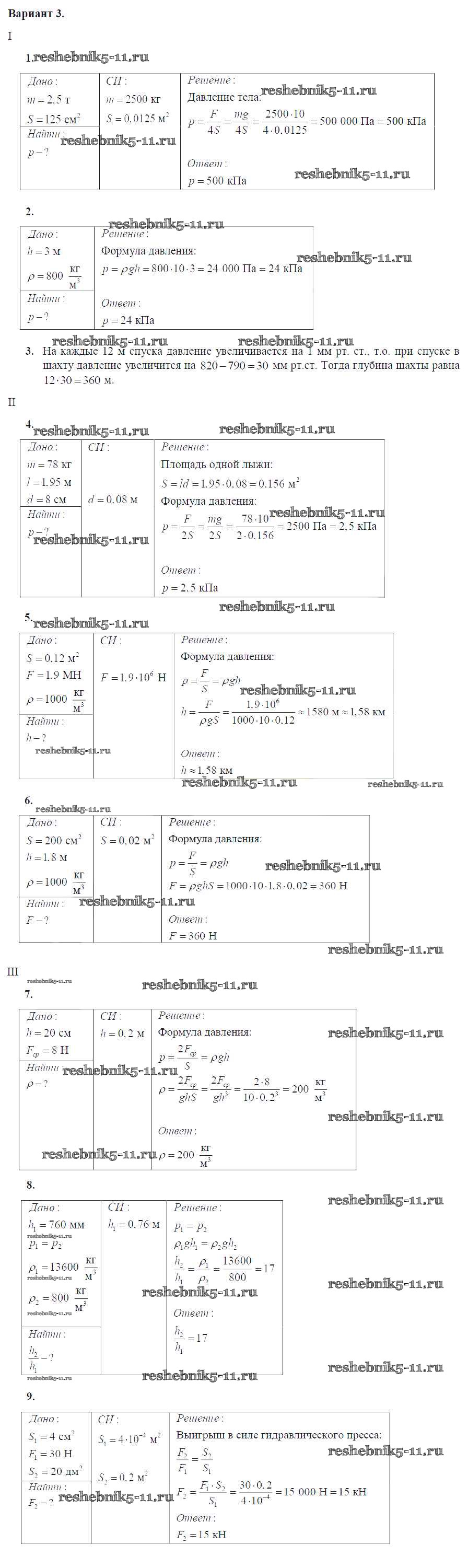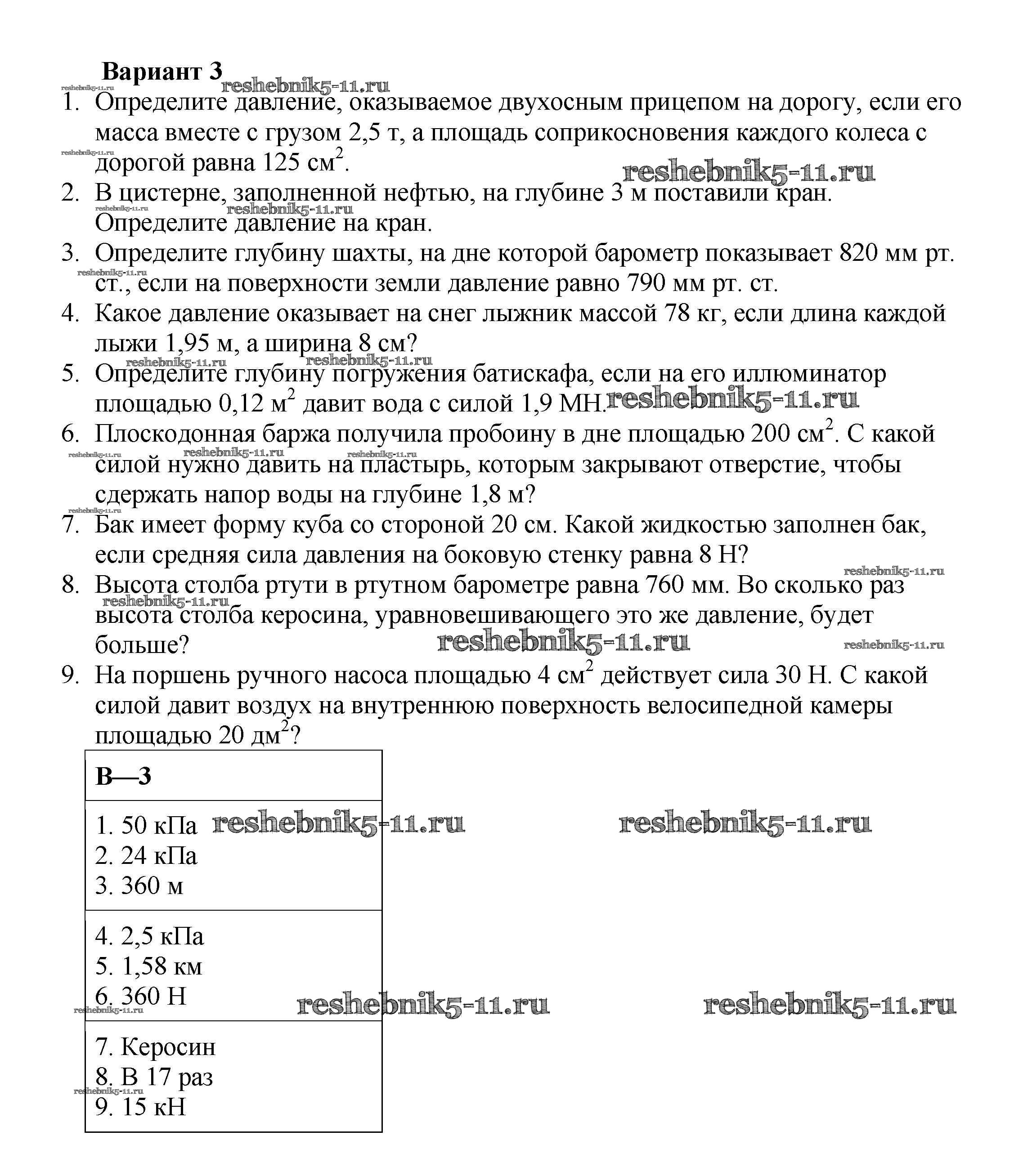 Готовая домашняя работа с ответами по Физике за 7 класс Марон Дидактические материалы Вертикаль Дрофа 2019 ФГОС - КР №-2. Давление твердых тел, жидкостей и газов Вариант №3