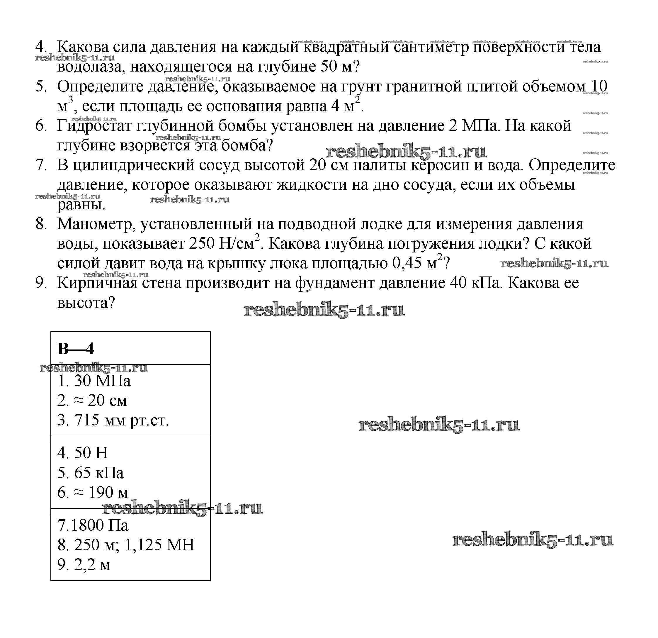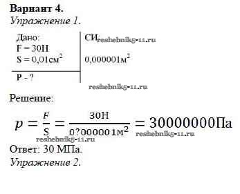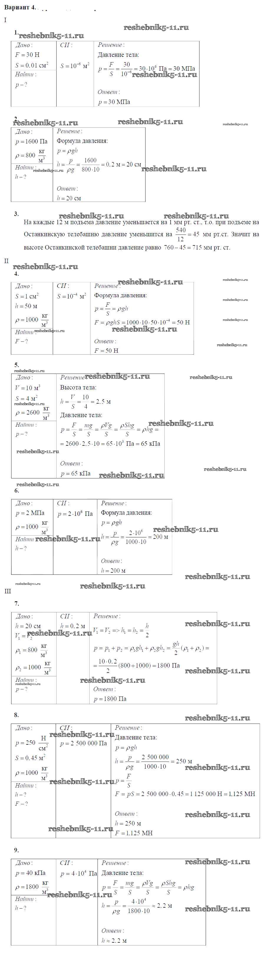 Готовая домашняя работа с ответами по Физике за 7 класс Марон Дидактические материалы Вертикаль Дрофа 2019 ФГОС - КР №-2. Давление твердых тел, жидкостей и газов Вариант №4