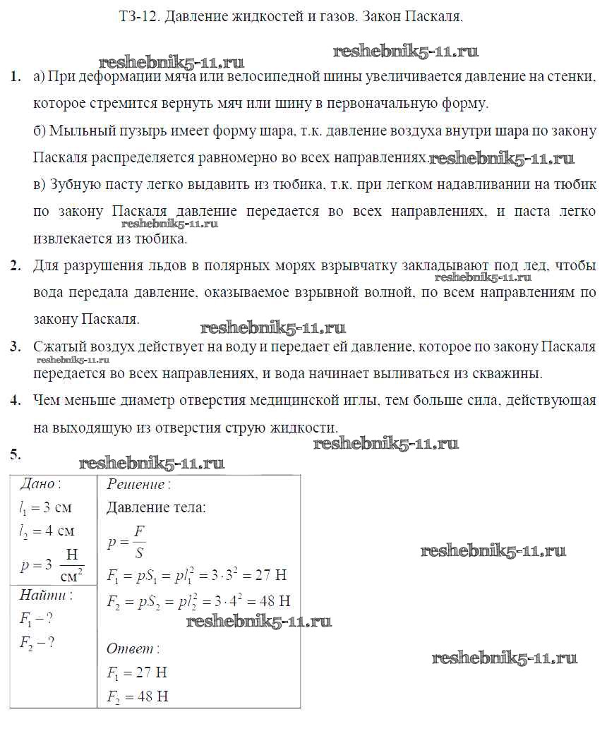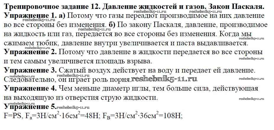 Готовая домашняя работа с ответами по Физике за 7 класс Марон Дидактические материалы Вертикаль Дрофа 2019 ФГОС - Тренировочные задания Задание №12. Давление жидкостей и газов. Закон Паскаля