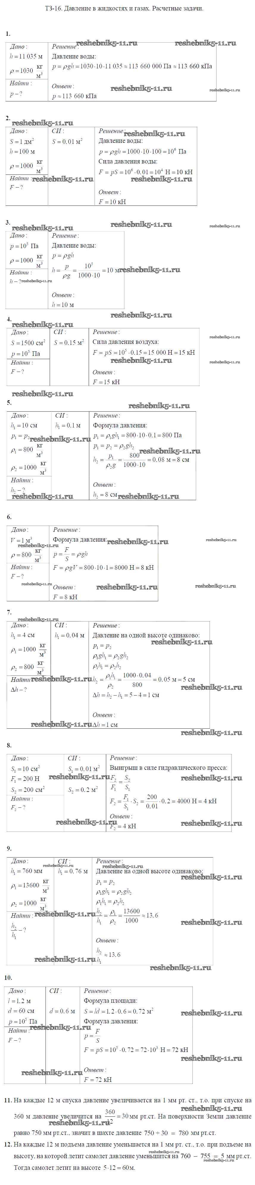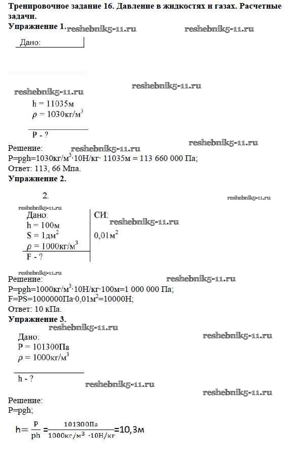 Готовая домашняя работа с ответами по Физике за 7 класс Марон Дидактические материалы Вертикаль Дрофа 2019 ФГОС - Тренировочные задания Задание №16. Давление в жидкостях и газах. Расчетные задачи