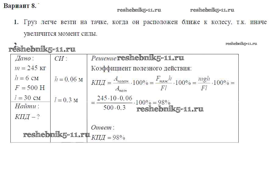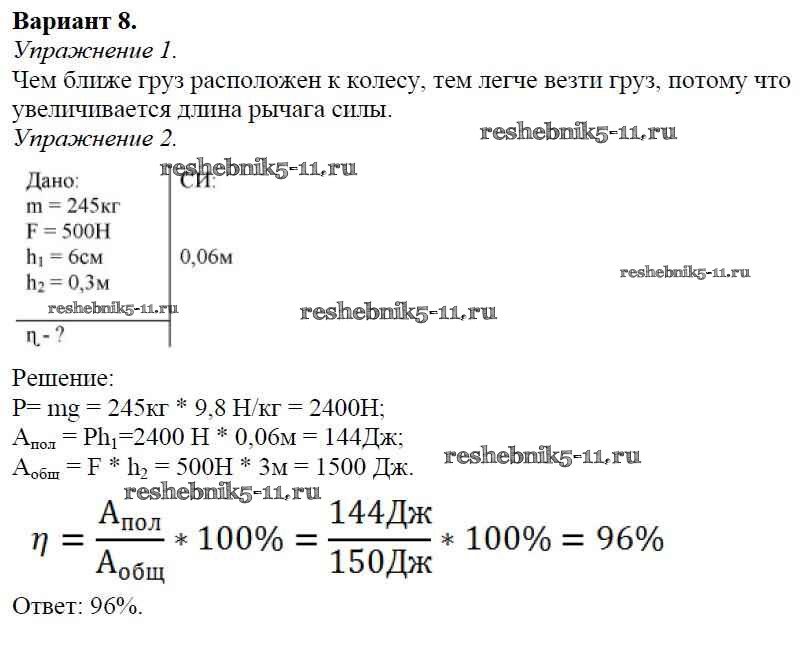 Готовая домашняя работа с ответами по Физике за 7 класс Марон Дидактические материалы Вертикаль Дрофа 2019 ФГОС - СР №-11. Простые механизмы. КПД простых механизмов Вариант №8
