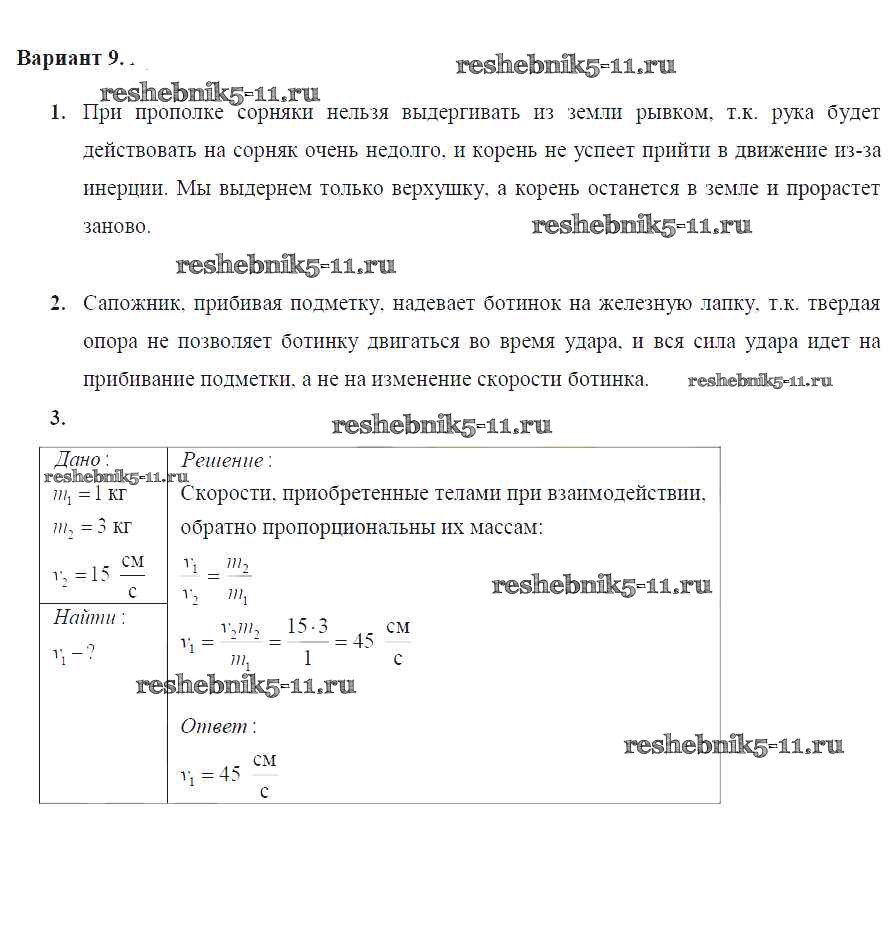 Готовая домашняя работа с ответами по Физике за 7 класс Марон Дидактические материалы Вертикаль Дрофа 2019 ФГОС - СР №-3. Инерция. Взаимодействие тел. Масса тела Вариант №9