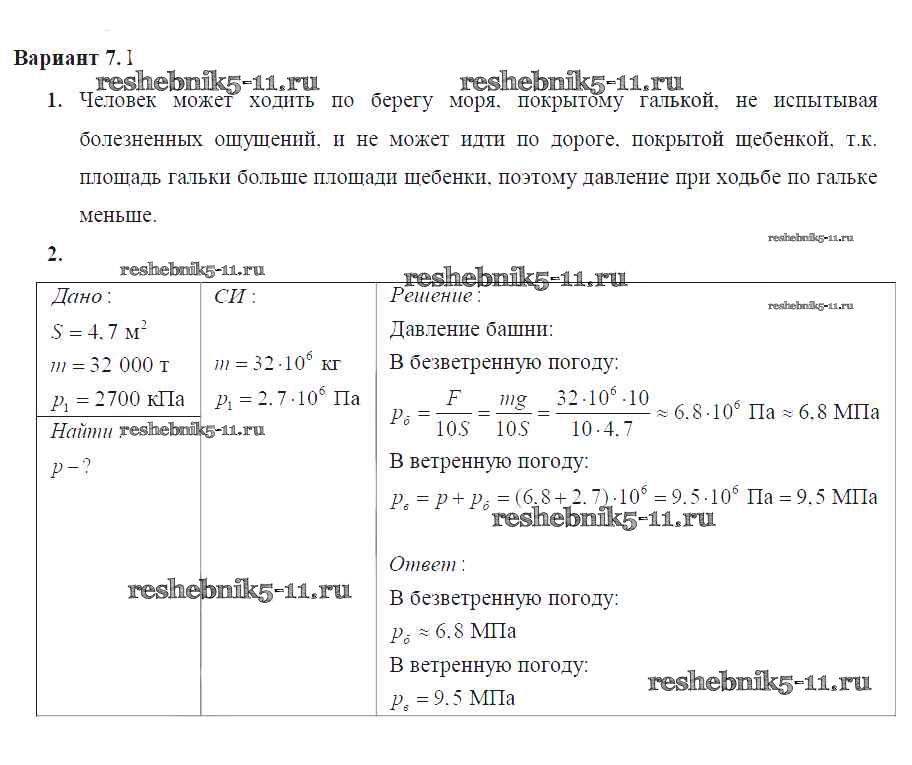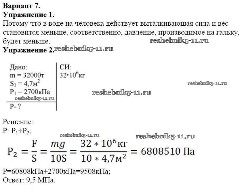 Готовая домашняя работа с ответами по Физике за 7 класс Марон Дидактические материалы Вертикаль Дрофа 2019 ФГОС - СР №-6. Давление твердых тел Вариант №7