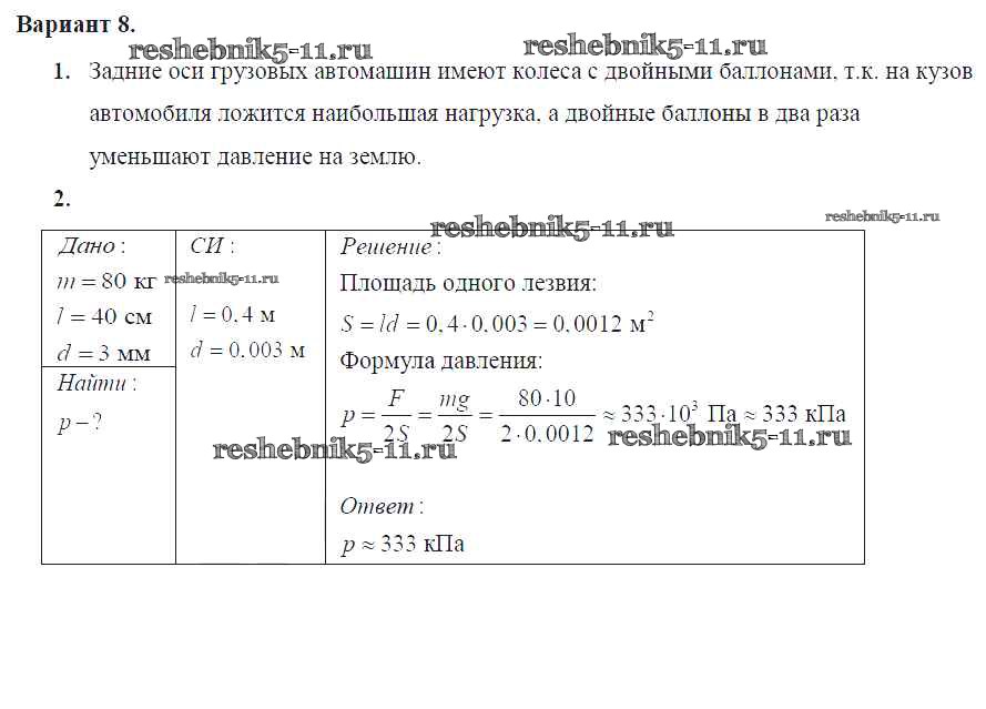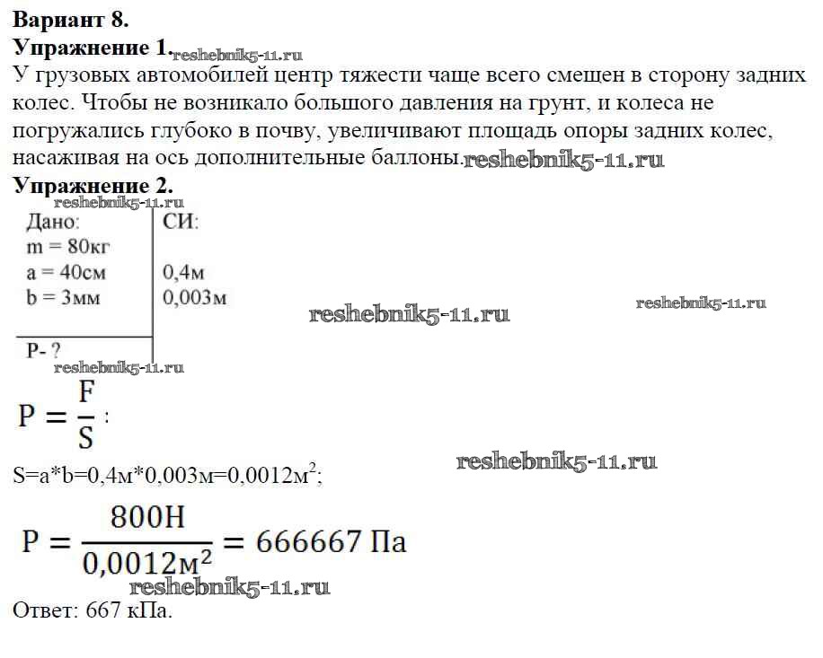 Готовая домашняя работа с ответами по Физике за 7 класс Марон Дидактические материалы Вертикаль Дрофа 2019 ФГОС - СР №-6. Давление твердых тел Вариант №8
