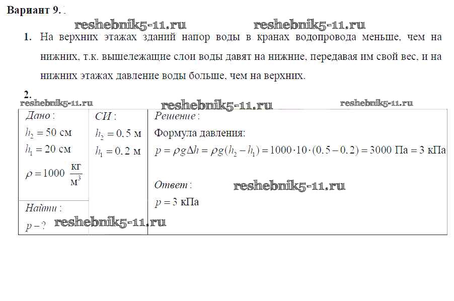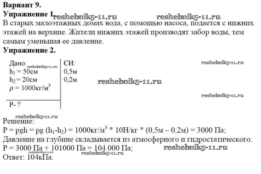 Готовая домашняя работа с ответами по Физике за 7 класс Марон Дидактические материалы Вертикаль Дрофа 2019 ФГОС - СР №-7. Давление в жидкостях и газах Вариант №9