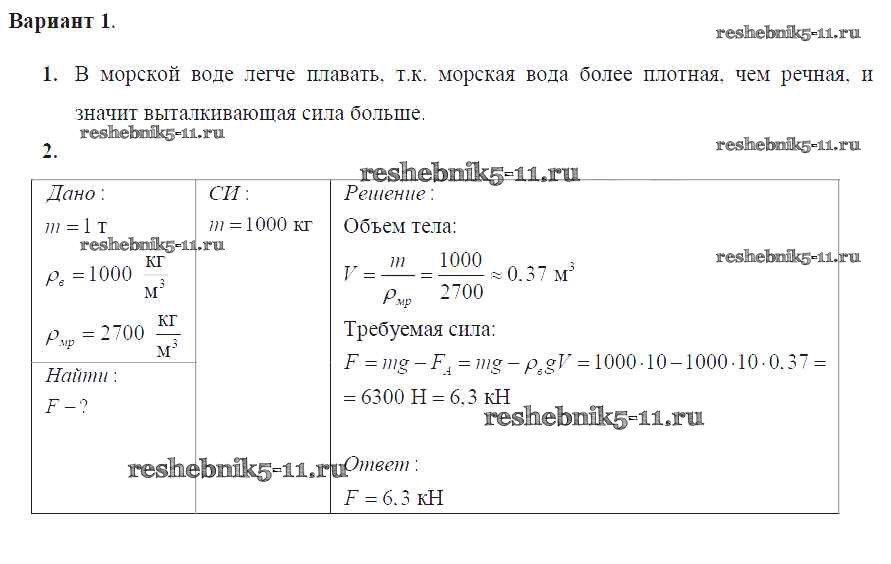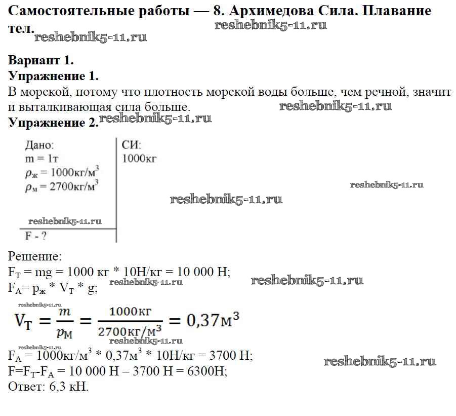 Готовая домашняя работа с ответами по Физике за 7 класс Марон Дидактические материалы Вертикаль Дрофа 2019 ФГОС - СР №-8. Архимедова сила. Плавание тел Вариант №1