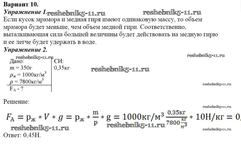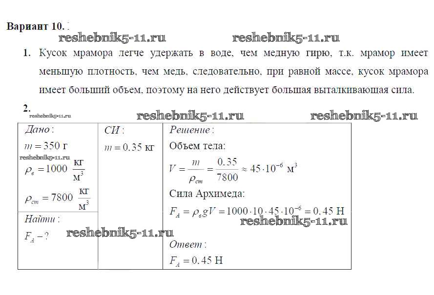 Готовая домашняя работа с ответами по Физике за 7 класс Марон Дидактические материалы Вертикаль Дрофа 2019 ФГОС - СР №-8. Архимедова сила. Плавание тел Вариант №10
