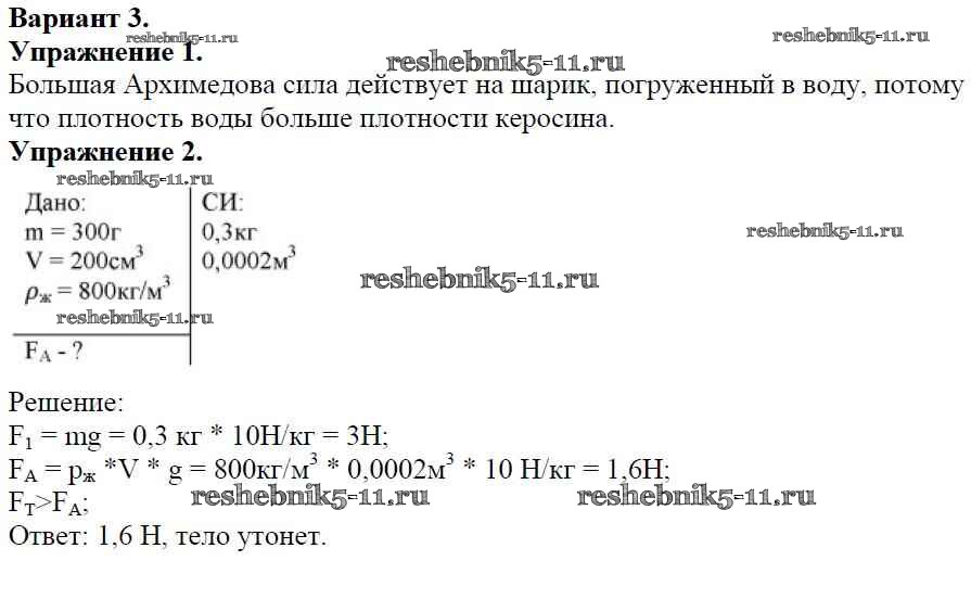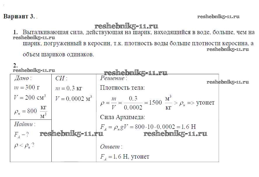 Готовая домашняя работа с ответами по Физике за 7 класс Марон Дидактические материалы Вертикаль Дрофа 2019 ФГОС - СР №-8. Архимедова сила. Плавание тел Вариант №3