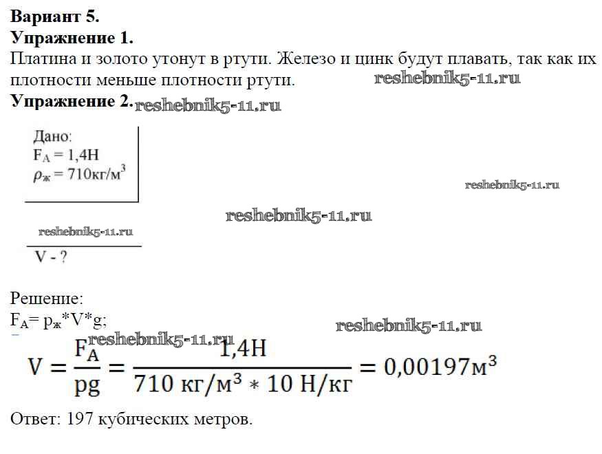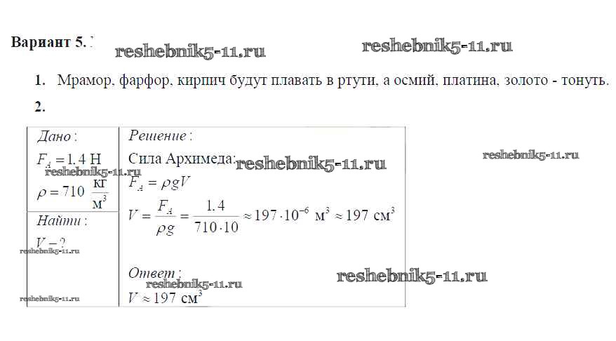 Готовая домашняя работа с ответами по Физике за 7 класс Марон Дидактические материалы Вертикаль Дрофа 2019 ФГОС - СР №-8. Архимедова сила. Плавание тел Вариант №5