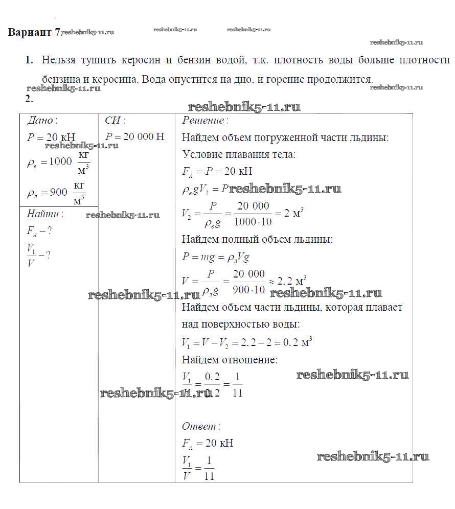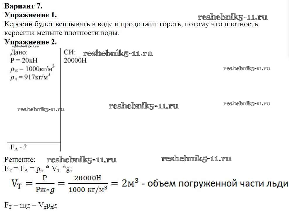 Готовая домашняя работа с ответами по Физике за 7 класс Марон Дидактические материалы Вертикаль Дрофа 2019 ФГОС - СР №-8. Архимедова сила. Плавание тел Вариант №7
