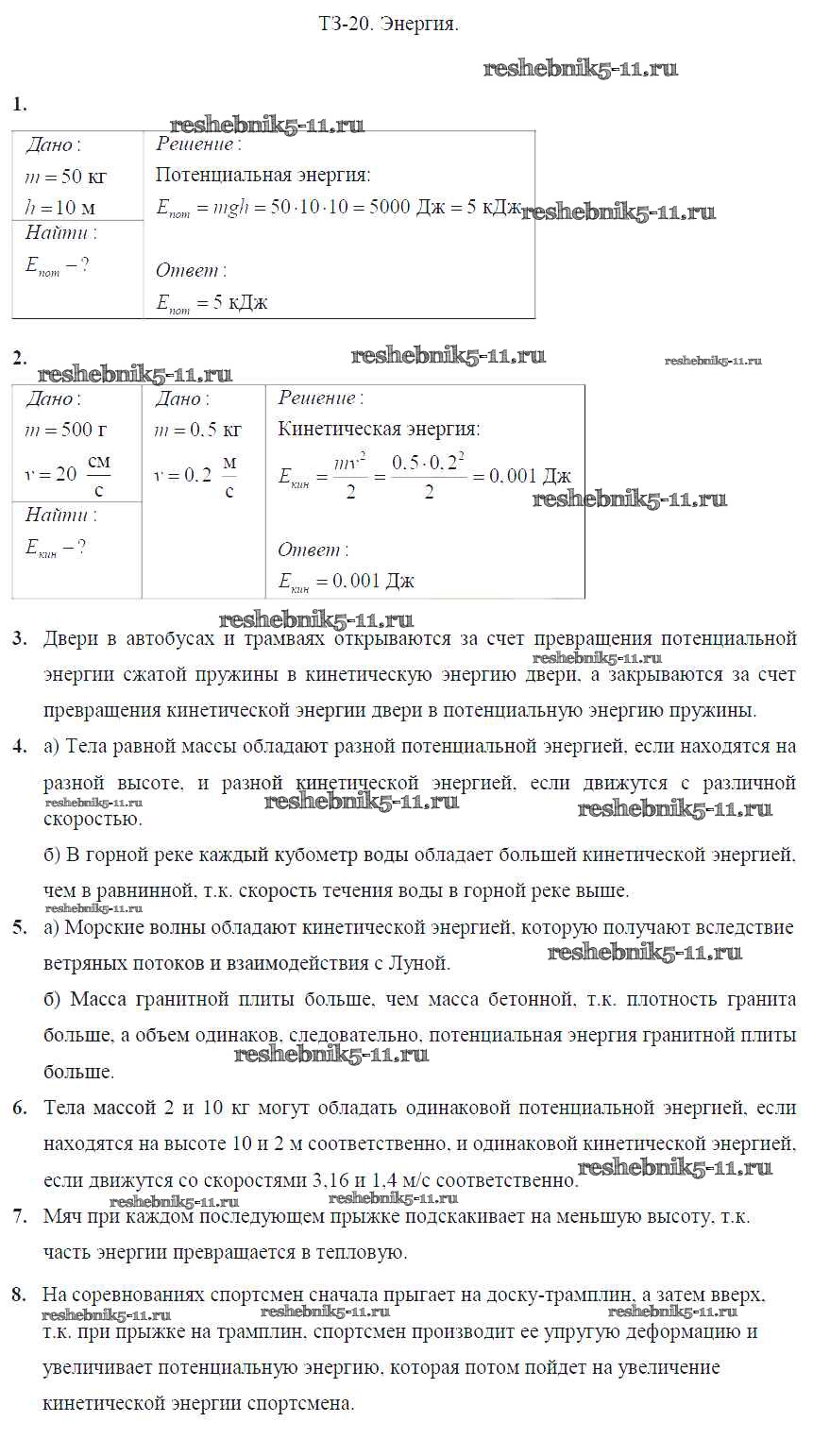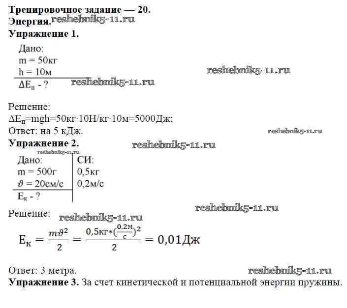 Готовая домашняя работа с ответами по Физике за 7 класс Марон Дидактические материалы Вертикаль Дрофа 2019 ФГОС - Тренировочные задания Задание №20. Энергия