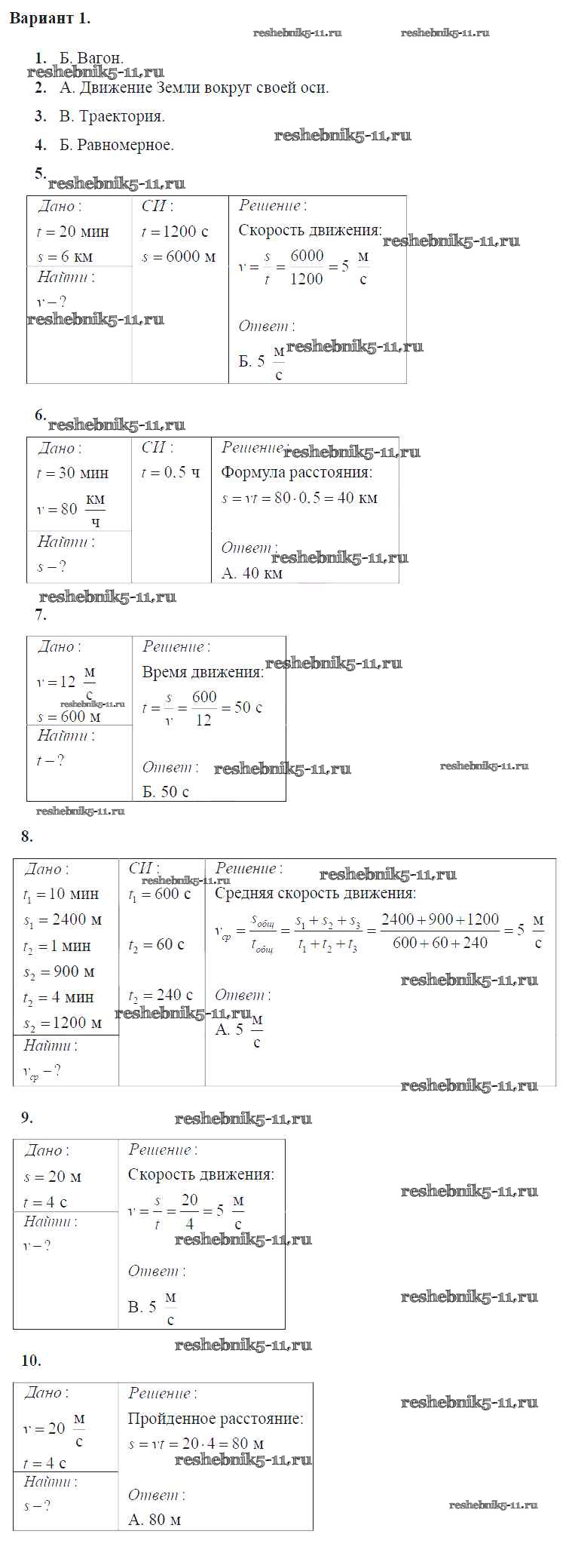 Готовая домашняя работа с ответами по Физике за 7 класс Марон Дидактические материалы Вертикаль Дрофа 2019 ФГОС - Тест №2. Механическое движение Вариант №1