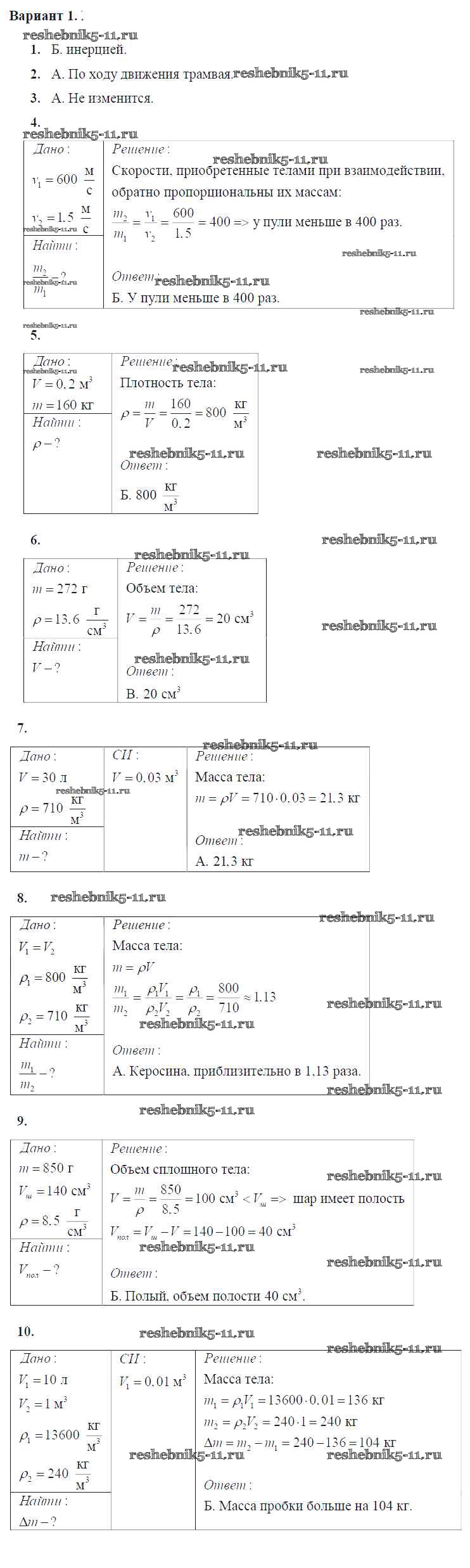 Готовая домашняя работа с ответами по Физике за 7 класс Марон Дидактические материалы Вертикаль Дрофа 2019 ФГОС - Тест №3. Инерция. Взаимодействие тел. Масса тела. Плотность вещества Вариант №1