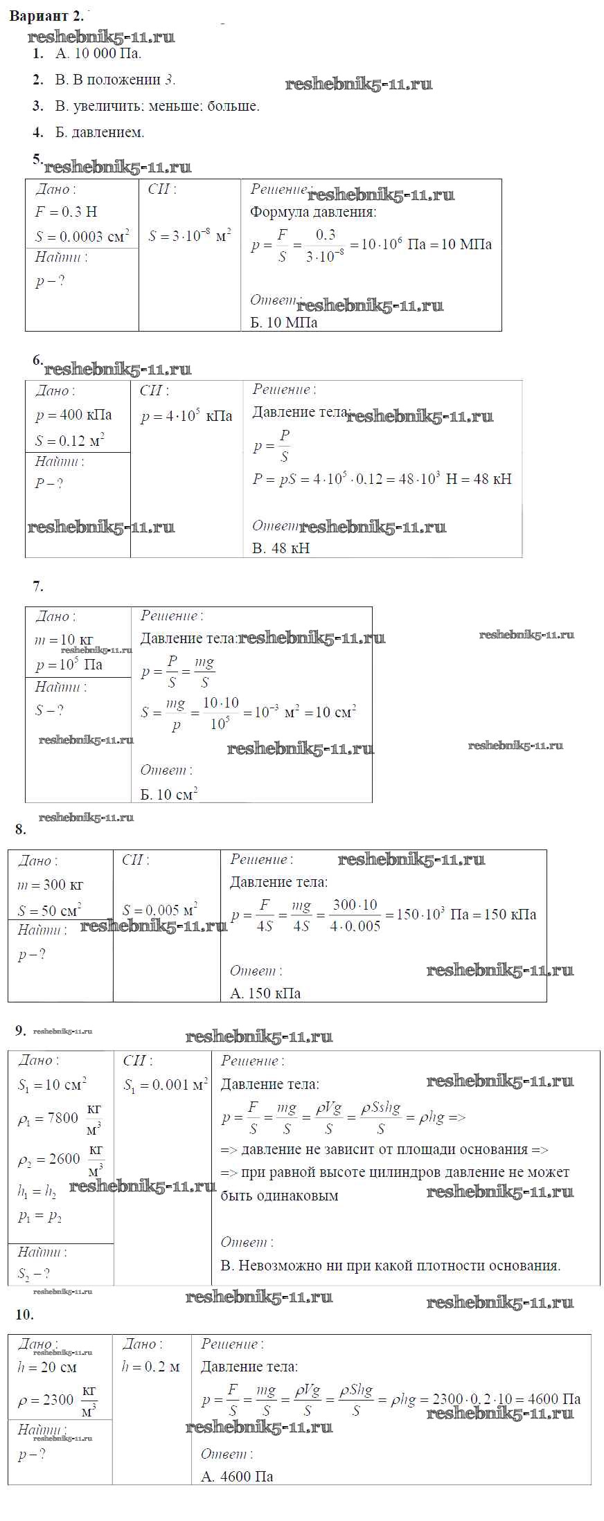 Готовая домашняя работа с ответами по Физике за 7 класс Марон Дидактические материалы Вертикаль Дрофа 2019 ФГОС - Тест №5. Давление твердых тел Вариант №2