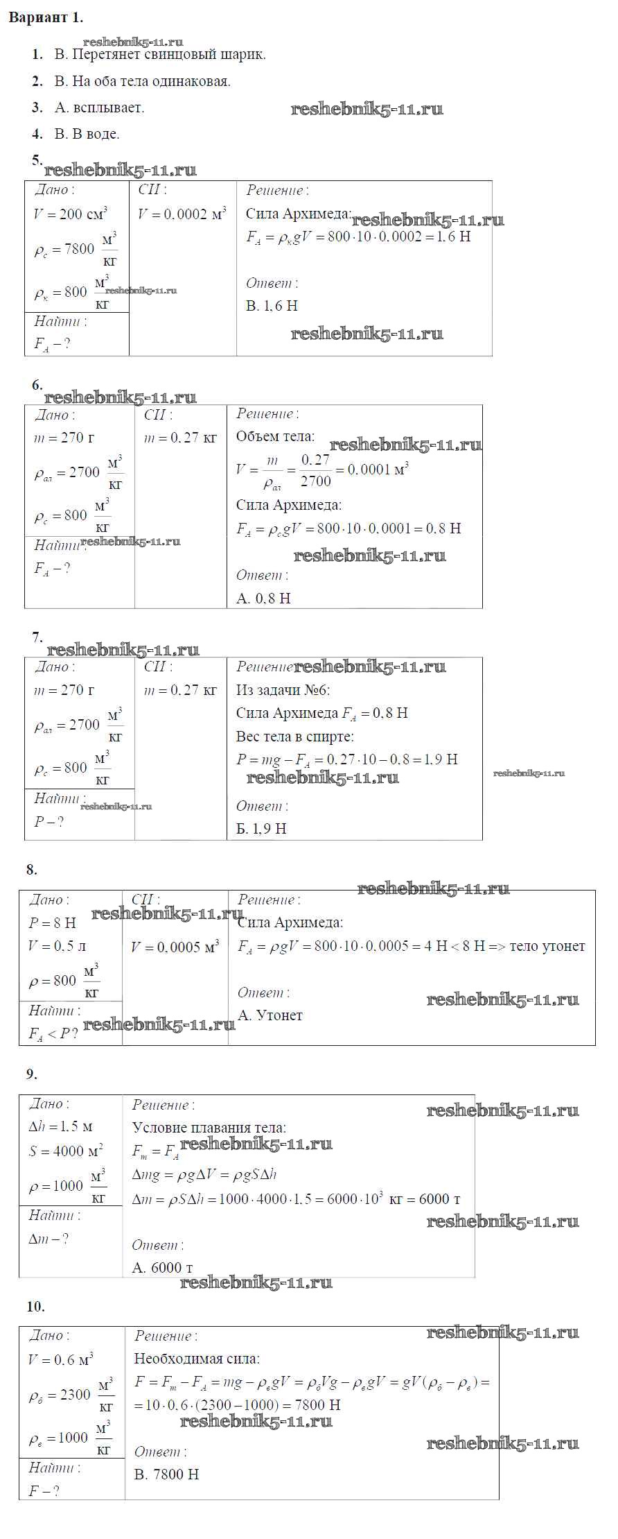 Готовая домашняя работа с ответами по Физике за 7 класс Марон Дидактические материалы Вертикаль Дрофа 2019 ФГОС - Тест №7. Архимедова сила. Плавание тел Вариант №1