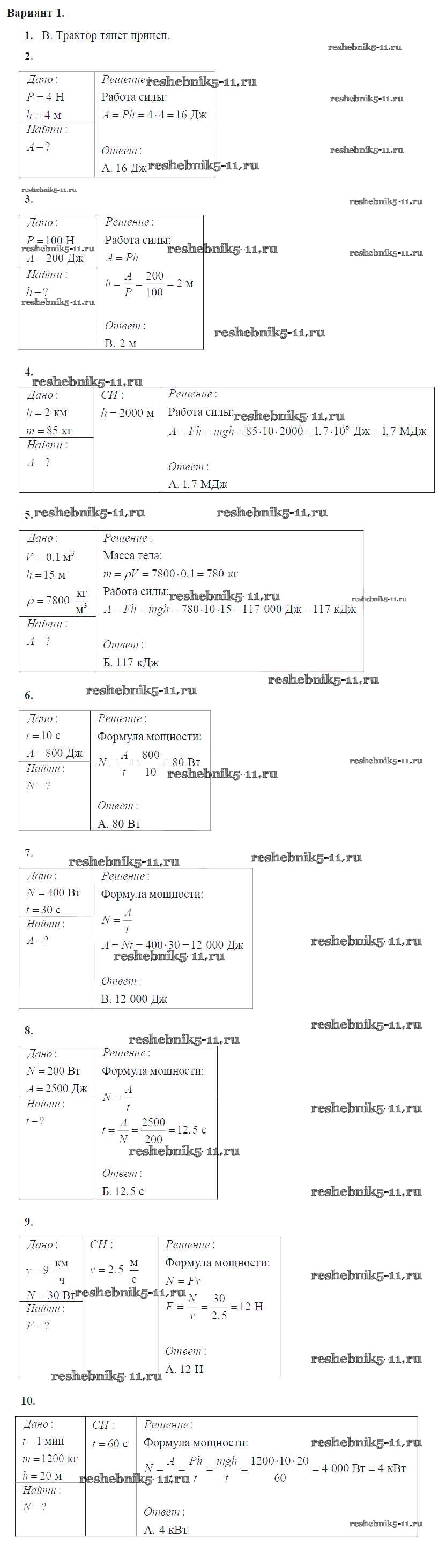 Готовая домашняя работа с ответами по Физике за 7 класс Марон Дидактические материалы Вертикаль Дрофа 2019 ФГОС - Тест №8. Механическая работа и мощность Вариант №1
