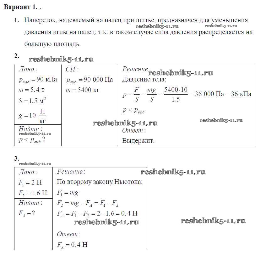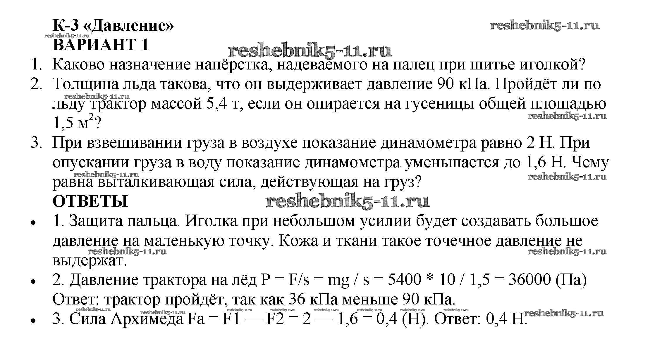 Решебник №2 / контрольная работа / кр №-3. давление твердых тел, жидкостей и газов / вариант №1