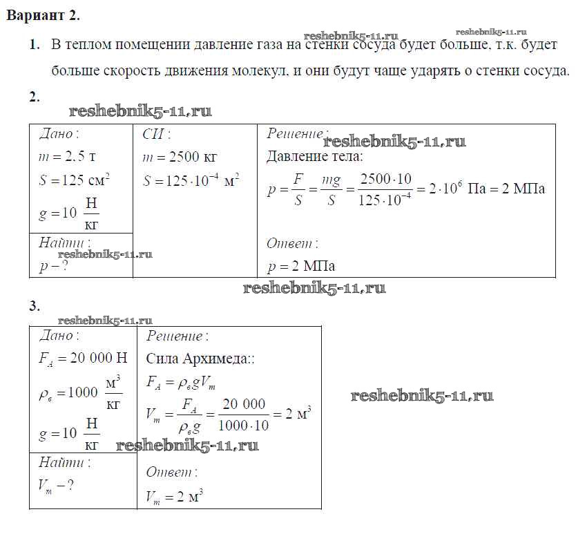 Решебник №2 / контрольная работа / кр №-3. давление твердых тел, жидкостей и газов / вариант №2