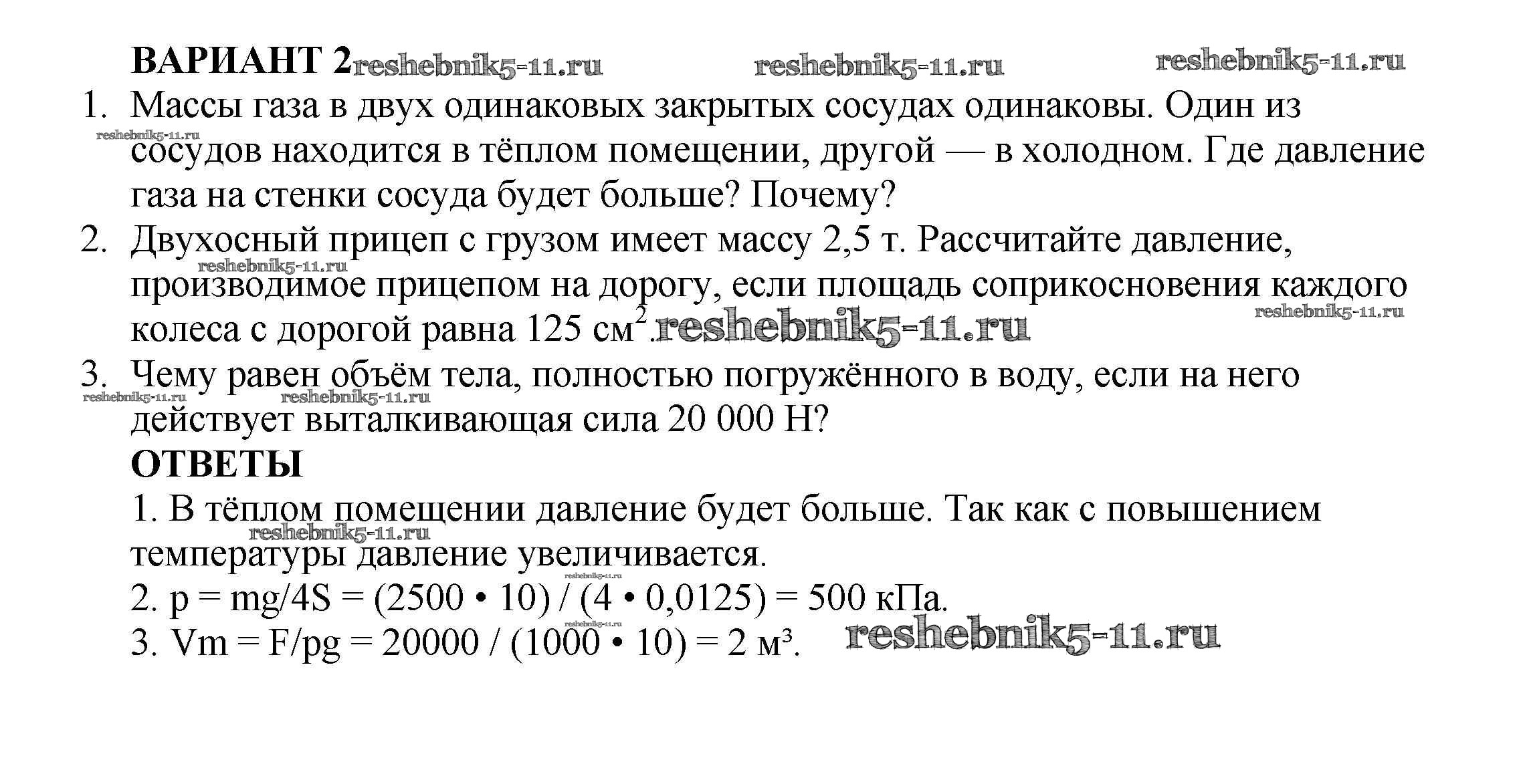 Готовая домашняя работа с ответами по Физике за 7 класс Марон Самостоятельные и контрольные работы Вертикаль Дрофа 2016 ФГОС - КР №-3. Давление твердых тел, жидкостей и газов Вариант №2