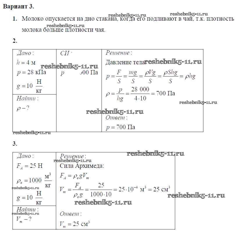 Готовая домашняя работа с ответами по Физике за 7 класс Марон Самостоятельные и контрольные работы Вертикаль Дрофа 2016 ФГОС - КР №-3. Давление твердых тел, жидкостей и газов Вариант №3