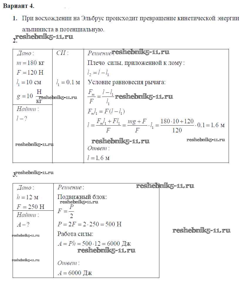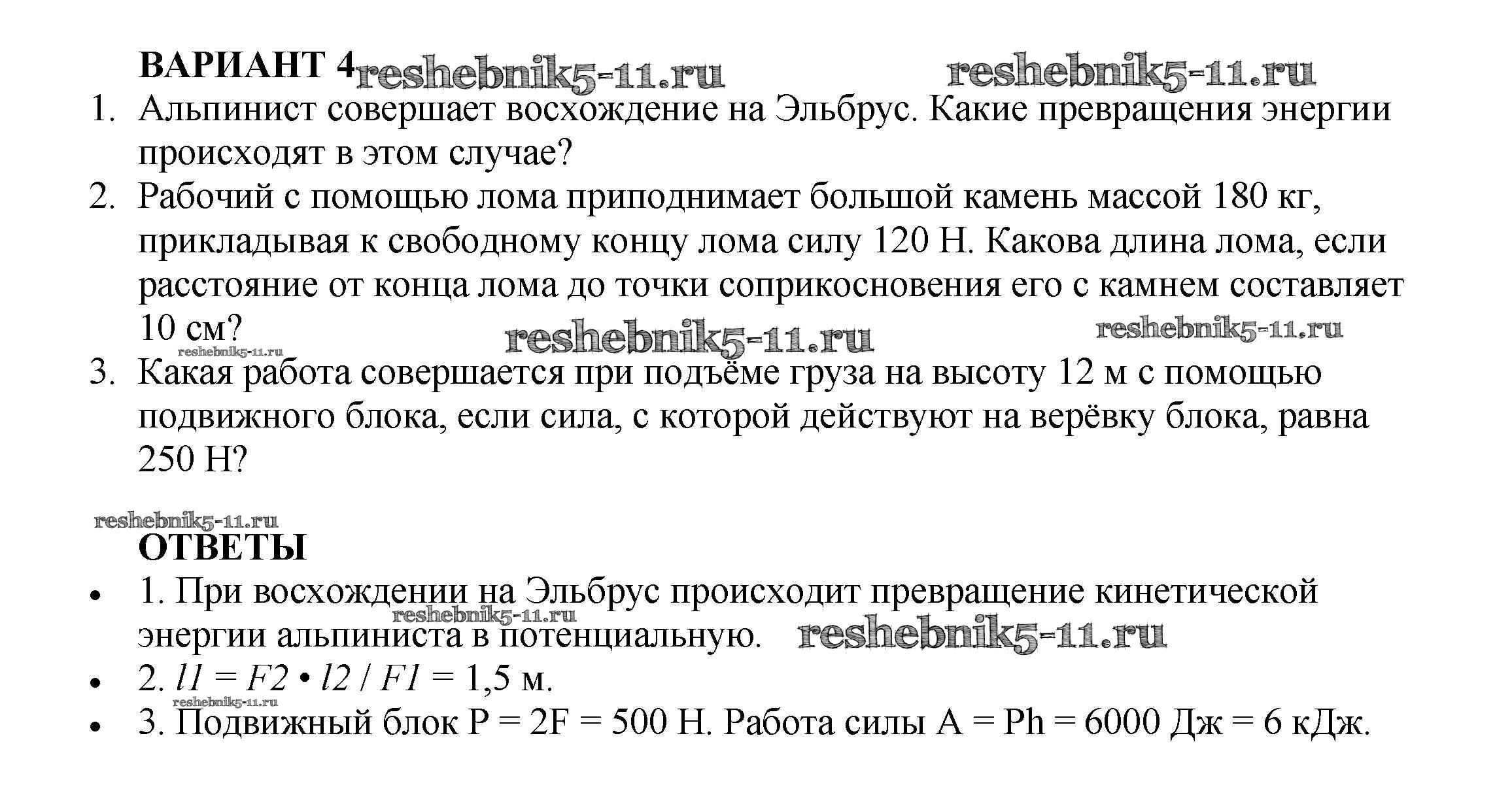 Решебник №2 / контрольная работа / кр №-4. работа и мощность. энергия / вариант №4