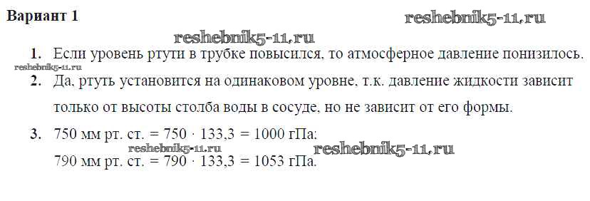 Готовая домашняя работа с ответами по Физике за 7 класс Марон Самостоятельные и контрольные работы Вертикаль Дрофа 2016 ФГОС - СР-№44. Измерение атмосферного давления. Опыт Торричелли Вариант №1