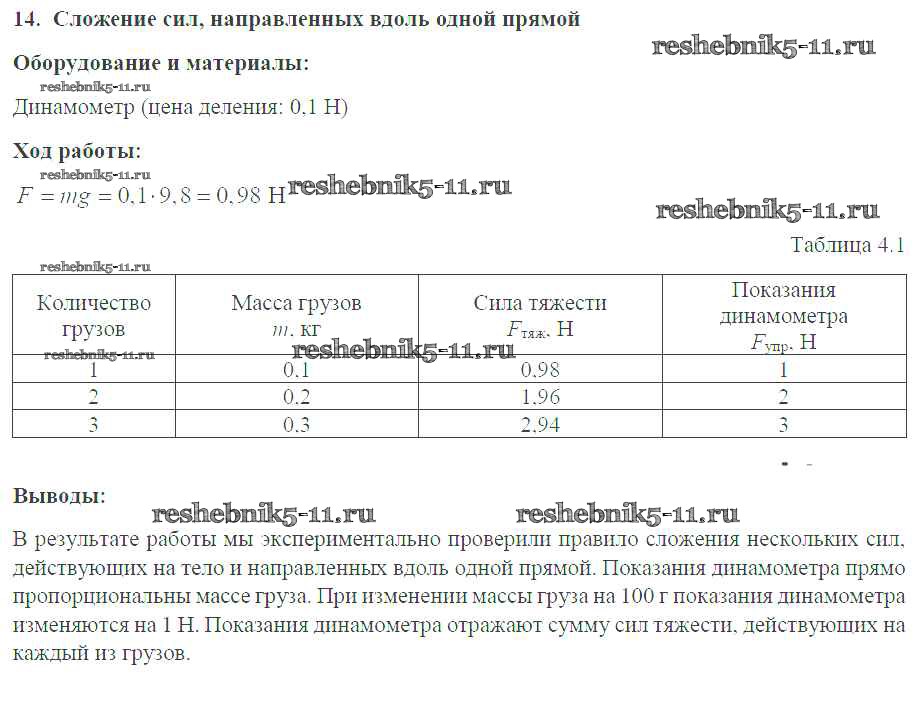 Готовая домашняя работа с ответами по Физике за 7 класс Белага, Воронцова, Жумаев, Ломаченков, Панебратцев Тетрадь-практикум Сферы Просвещение 2012 ФГОС - Лабораторные работы №14. Сложение сил, направленных вдоль одной прямой