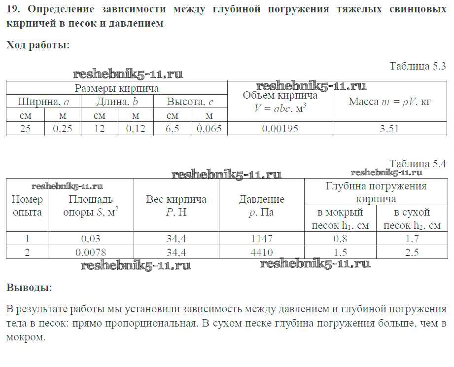 Готовая домашняя работа с ответами по Физике за 7 класс Белага, Воронцова, Жумаев, Ломаченков, Панебратцев Тетрадь-практикум Сферы Просвещение 2012 ФГОС - Лабораторные работы №19. Определение зависимости между глубиной погружения тяжелых свинцовых кирпичей в песок и давлением