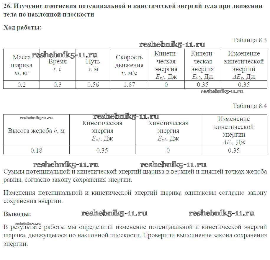 Готовая домашняя работа с ответами по Физике за 7 класс Белага, Воронцова, Жумаев, Ломаченков, Панебратцев Тетрадь-практикум Сферы Просвещение 2012 ФГОС - Лабораторные работы №26. Изучение изменения потенциальной и кинетической энергии тела при движении тела по наклонной плоскости