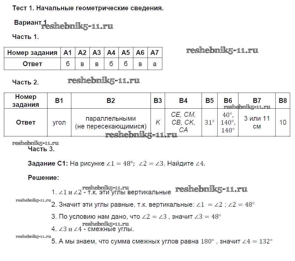 Готовая домашняя работа с ответами по Геометрии за 7 класс Фарков Тесты УМК Экзамен 2015 ФГОС - Глава 1. Варианты 1