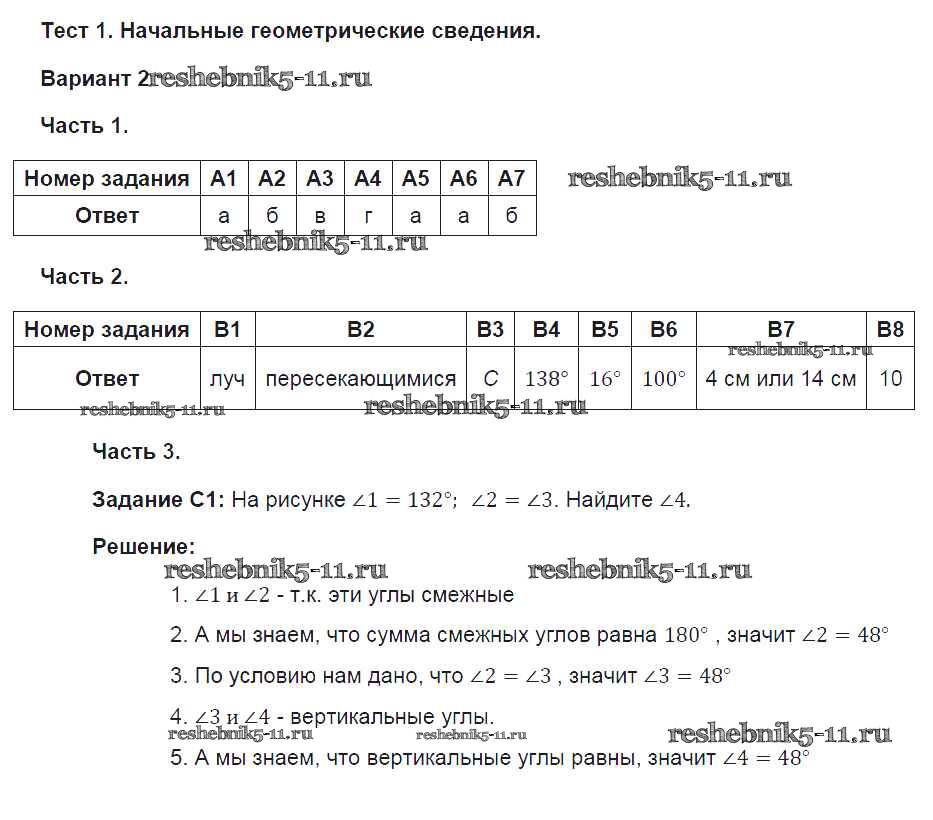 Готовая домашняя работа с ответами по Геометрии за 7 класс Фарков Тесты УМК Экзамен 2015 ФГОС - Глава 1. Варианты 2