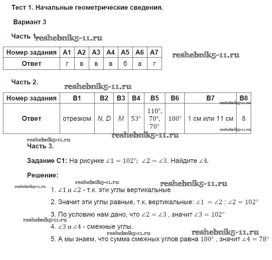 Готовая домашняя работа с ответами по Геометрии за 7 класс Фарков Тесты УМК Экзамен 2015 ФГОС - Глава 1. Варианты 3