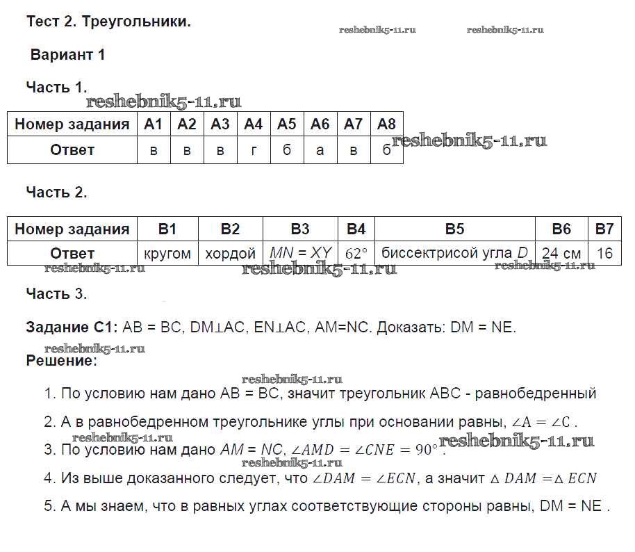 Готовая домашняя работа с ответами по Геометрии за 7 класс Фарков Тесты УМК Экзамен 2015 ФГОС - Глава 2. Варианты 1