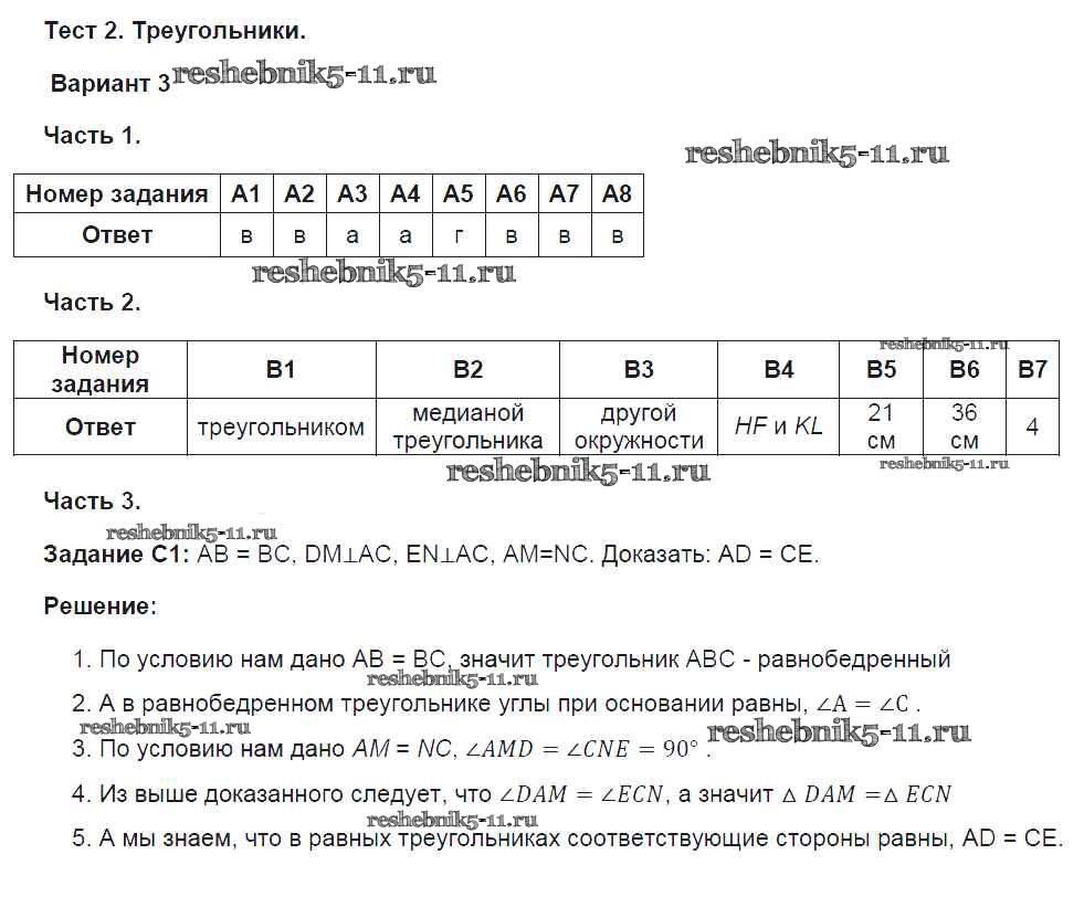 Готовая домашняя работа с ответами по Геометрии за 7 класс Фарков Тесты УМК Экзамен 2015 ФГОС - Глава 2. Варианты 3
