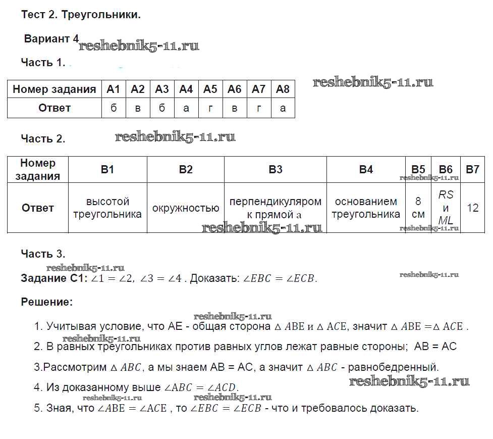 Готовая домашняя работа с ответами по Геометрии за 7 класс Фарков Тесты УМК Экзамен 2015 ФГОС - Глава 2. Варианты 4