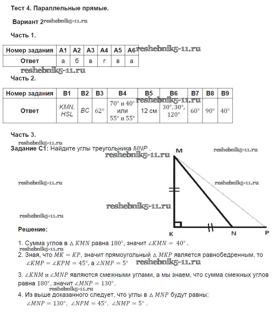 Готовая домашняя работа с ответами по Геометрии за 7 класс Фарков Тесты УМК Экзамен 2015 ФГОС - Глава 4. Варианты 2